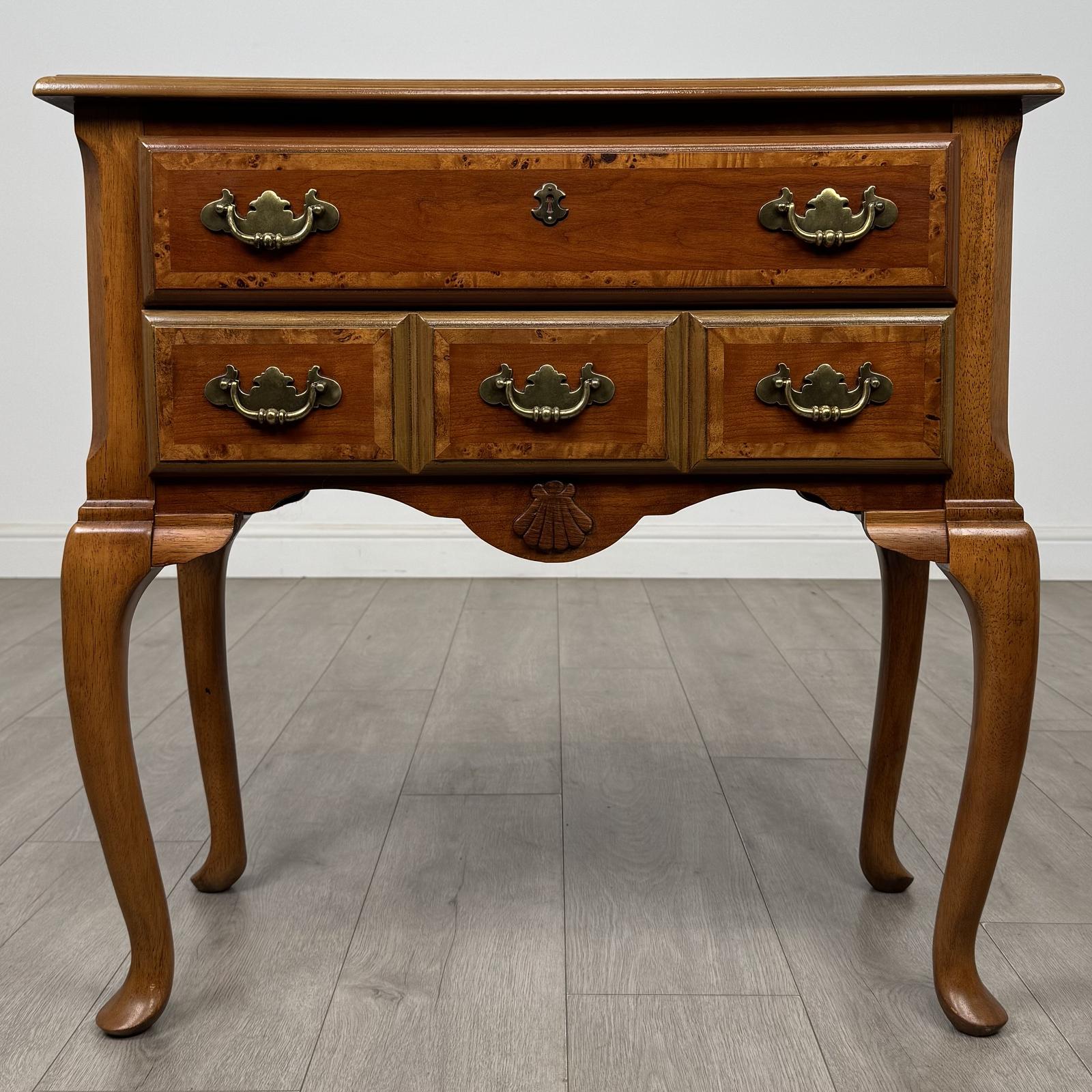 The table is constructed from beech with burr walnut inlay and crossbanding, reflecting a fine reproduction of an older style. It features two front drawers, with the bottom drawer cleverly disguised as three smaller drawers. The piece retains all its original brass handles and fittings.