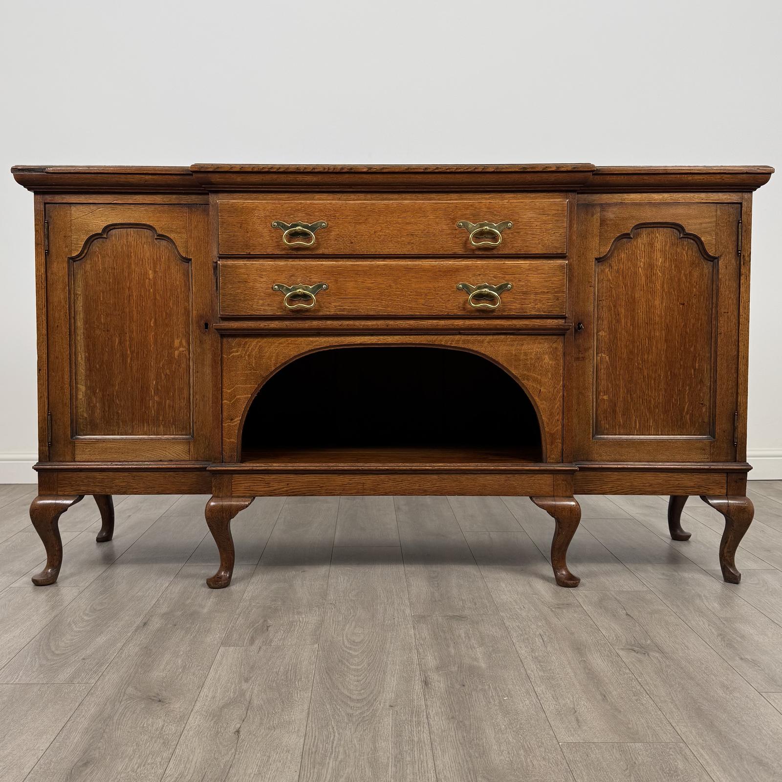Very well made and sturdy in construction, the piece stands on elegant cabriole legs and features two central drawers, an open shelf below, and a cupboard on either side, each fitted with an internal shelf for practical storage.