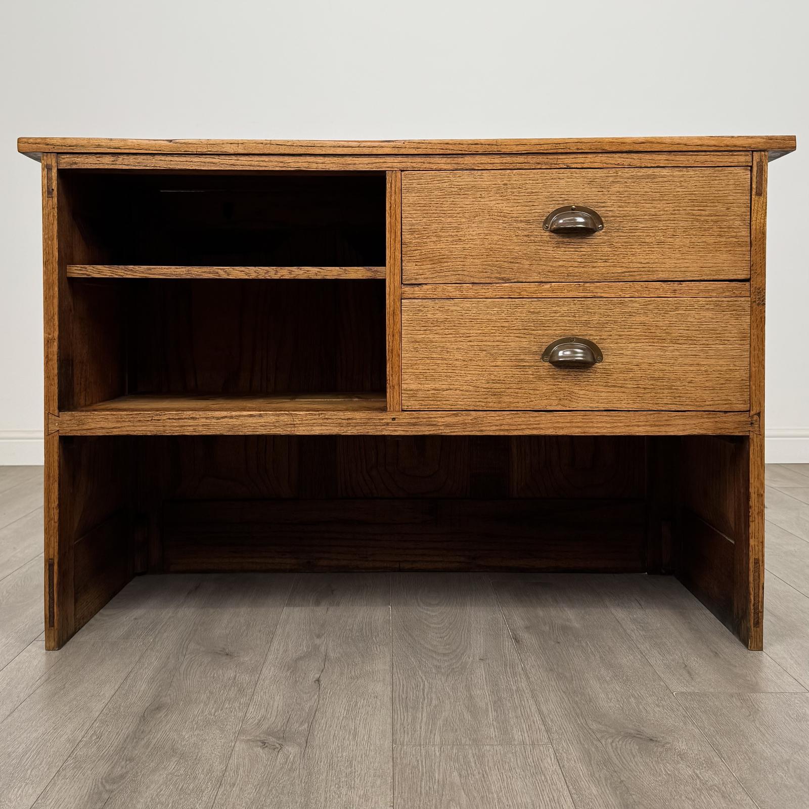 A charming antique 20th century good quality sideboard in oak, very well made and of solid construction, displaying attractive craftsmanship throughout. The design features an open shelf to the left, providing useful display or storage space, alongside two drawers to the right for additional practicality. The oak displays a gorgeous grain and warm colour throughout, giving the piece a rich and natural appearance.