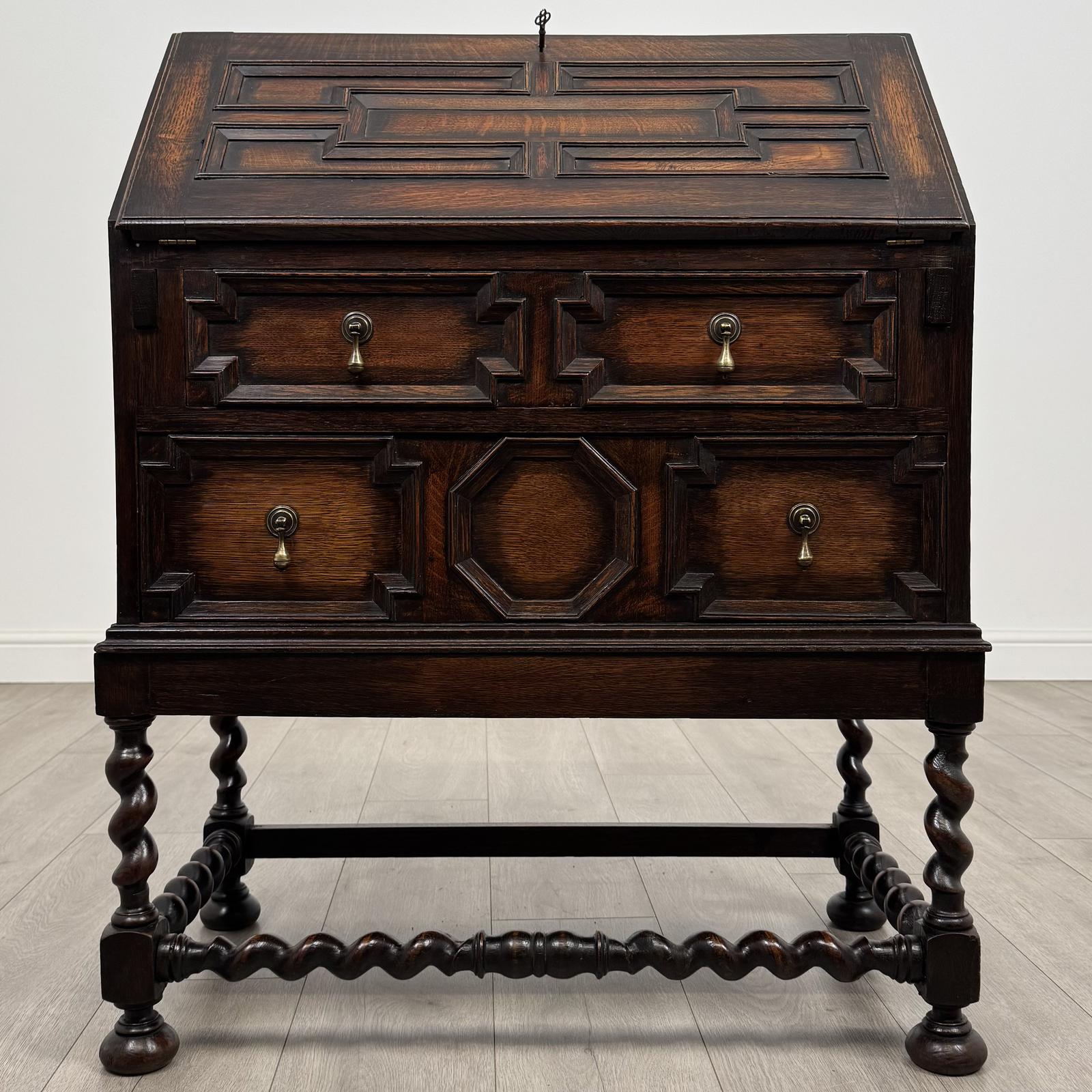 The bureau stands on elegant barley twist legs with a matching barley twist stretcher, showcasing its classic Jacobean design. Crafted from oak, it displays gorgeous grain and rich colour throughout, with stunning geometric decoration adding to its character and visual appeal.