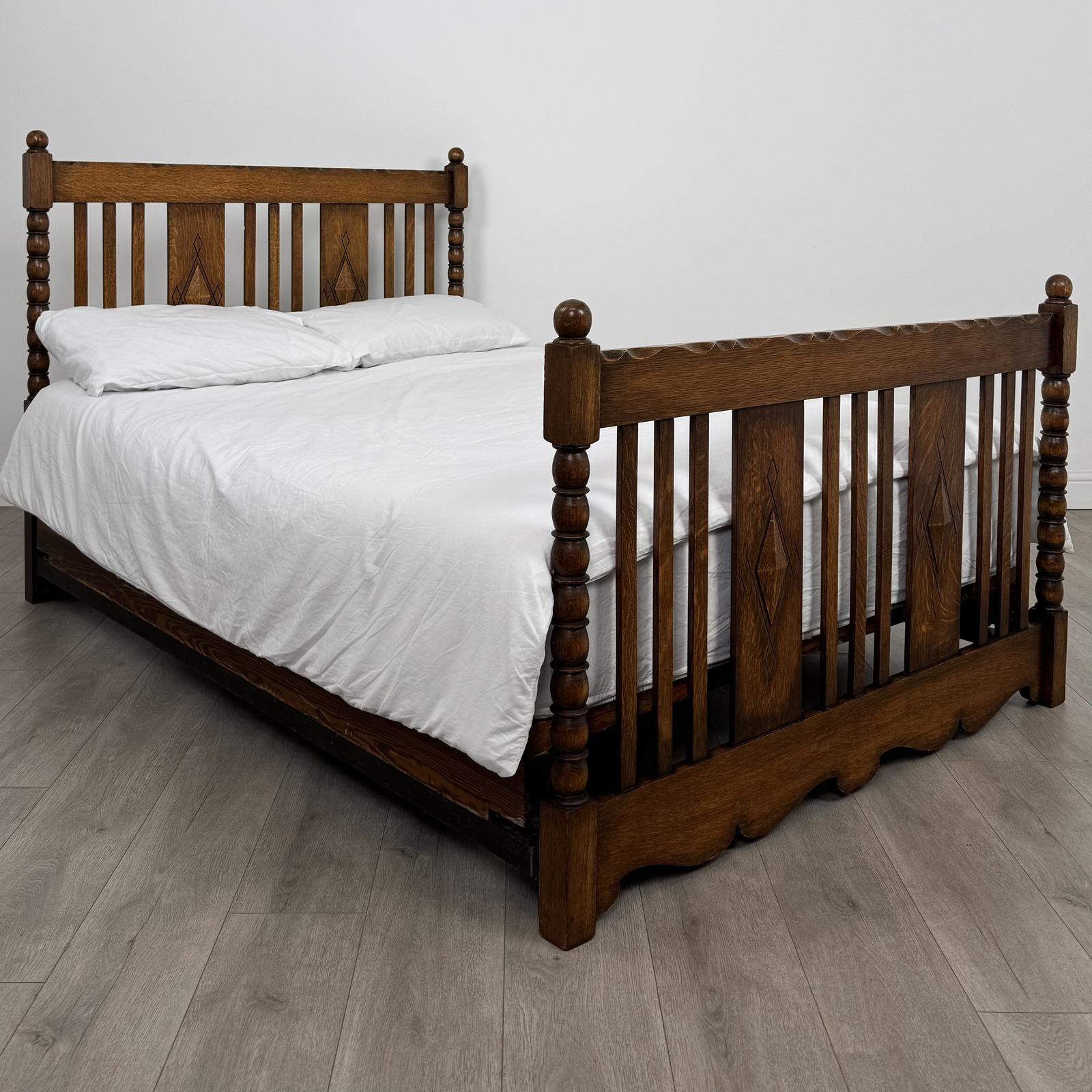 An antique 20th century Jacobean style double bed in oak, of excellent quality and fine craftsmanship.