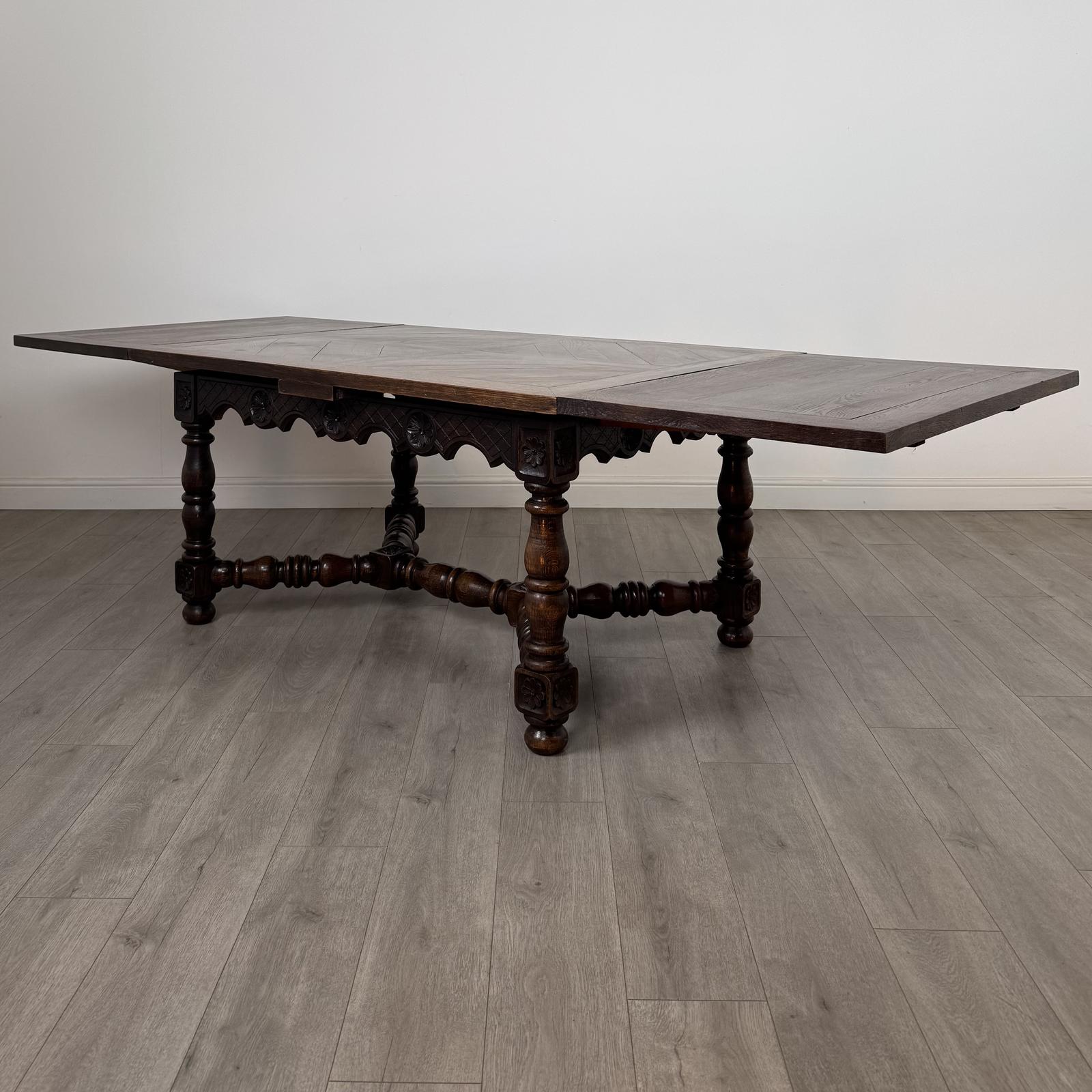 Antique 20th century Jacobean-style draw-leaf dining table in oak, a very well-made piece of good quality, showcasing fine craftsmanship and elegant design.