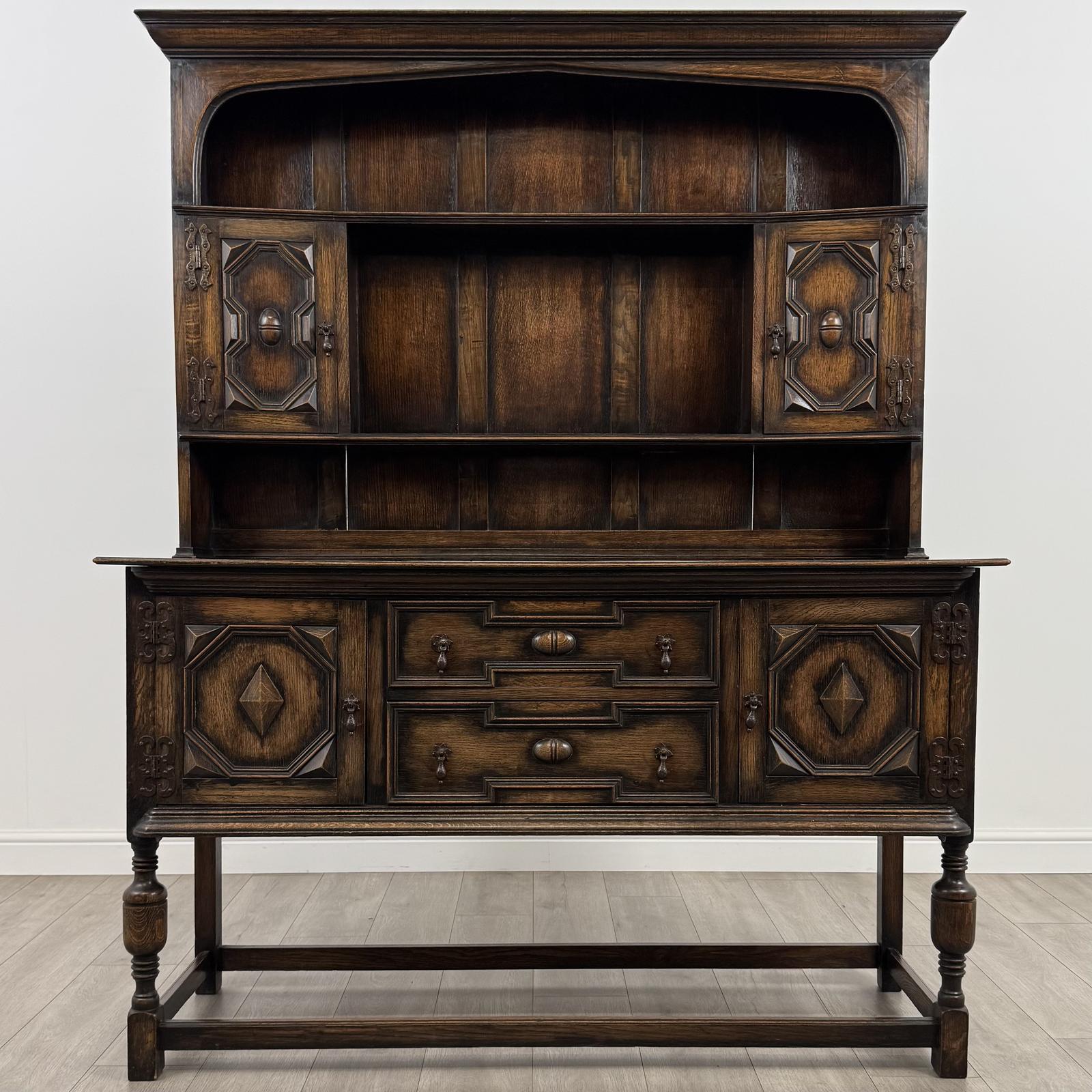 Antique 20th century Jacobean style dresser in oak, very well made and of good quality and a highly desirable example. The piece is beautifully decorated throughout and displays gorgeous grain and colour across all sections. The upper section features two open shelves flanked by two small cupboards, providing both display and practical storage. The base consists of two central drawers, with a cupboard on either side, offering ample space for everyday use. It stands on turned legs with a supporting stretcher, giving the dresser a strong and traditional Jacobean presence.