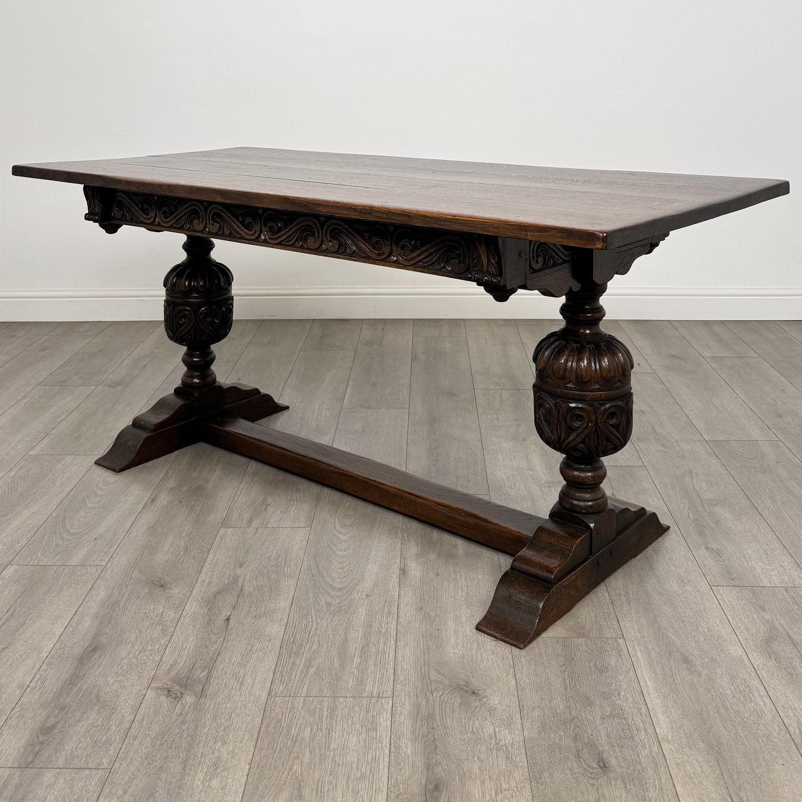 Antique 20th century Jacobean style oak dining table, stood on a refractory-style base with turned carved supports.