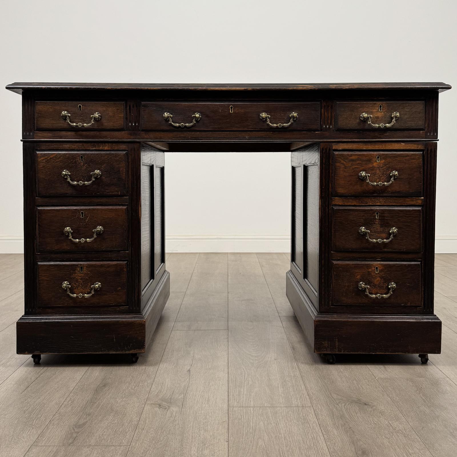 This Antique 20th Century Leather Top Pedestal Desk In Oak is located in Worcestershire, United Kingdom