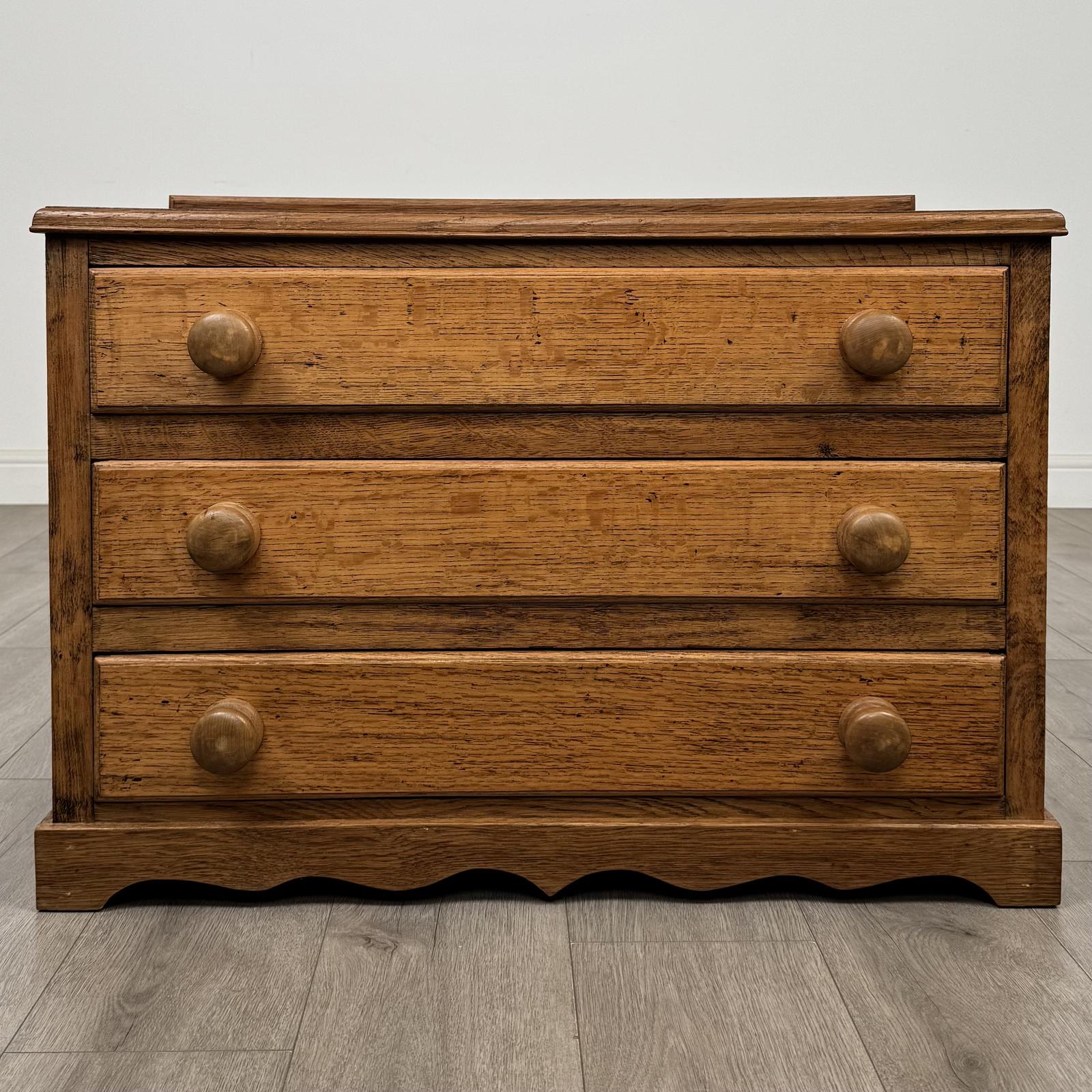 A charming antique 20th century low chest of drawers in oak, well made and displaying attractive craftsmanship throughout. The piece features three drawers to the front, all fitted with their original knob handles, providing practical and convenient storage. It has a small raised gallery to the top, adding a subtle decorative touch, while the bracket feet give it a classic and balanced appearance. The oak displays a gorgeous grain and warm colour throughout, enhancing its natural character and appeal.