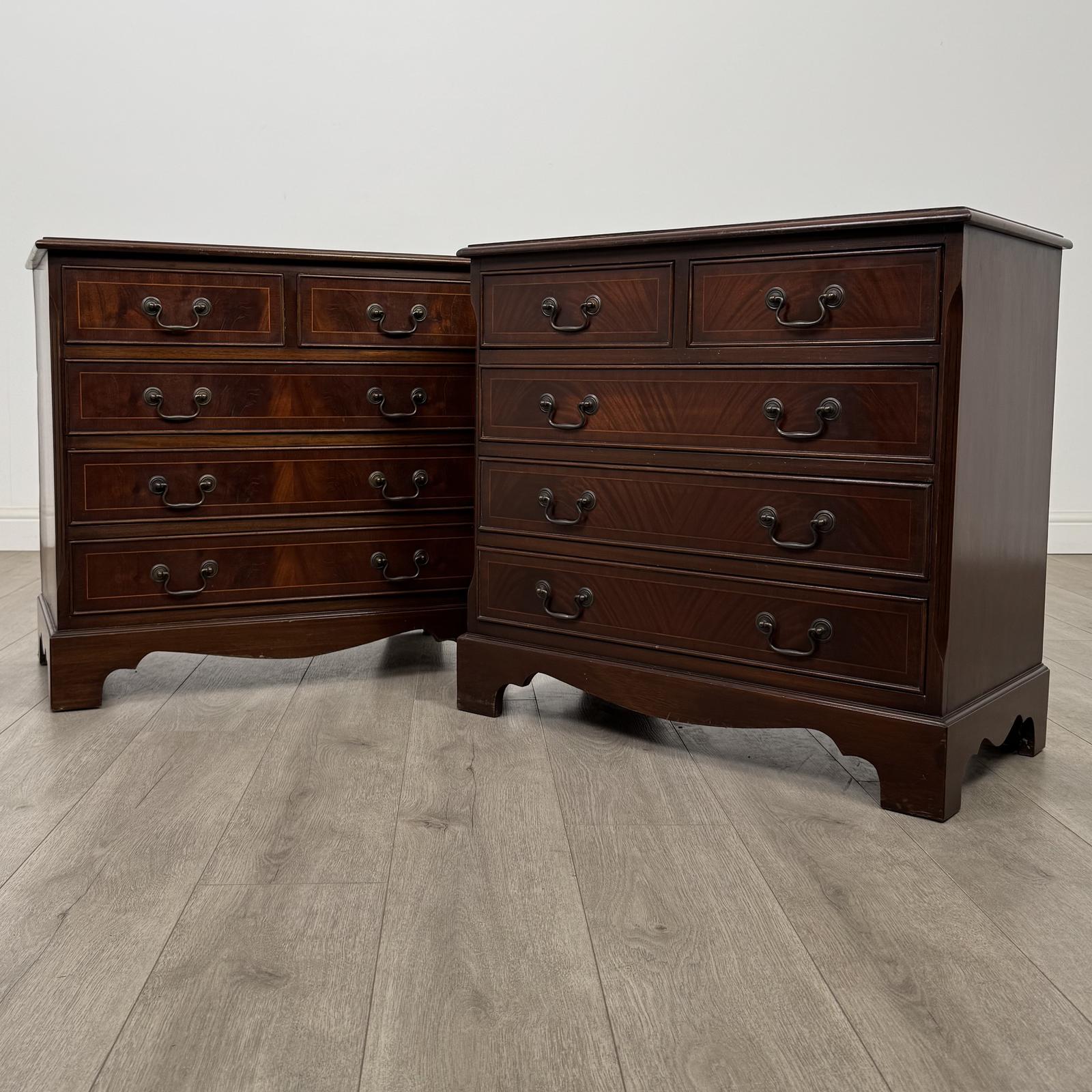 Antique 20th century pair of mahogany chest of drawers, a well-made and good-quality set, each featuring five drawers in total arranged as two small over three large.