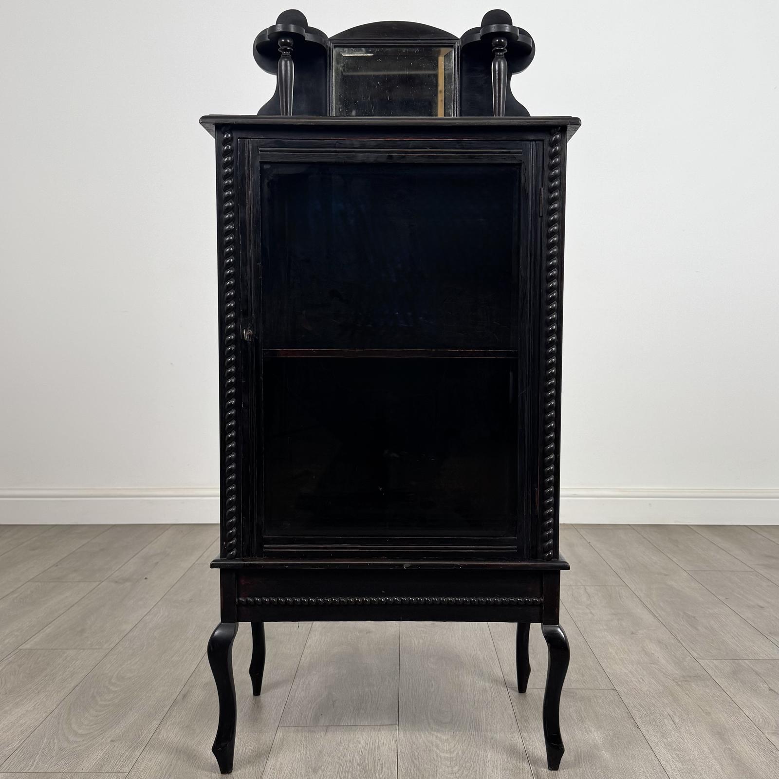 Antique 20th century small ebonized cabinet, a striking and decorative piece of good quality craftsmanship. Very well made, it features an elegant arched gallery to the top with a bevelled mirror and turned supports, adding height and visual interest.