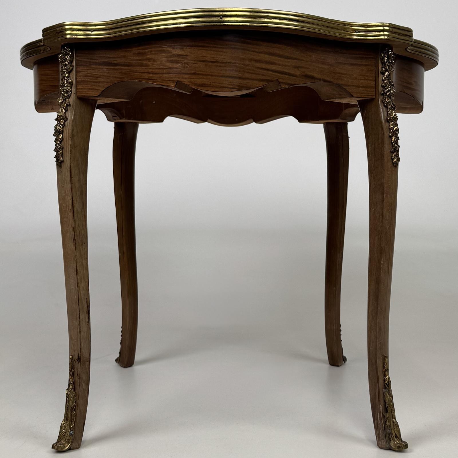 Antique 20th century small French side table in mahogany, very well made and of good quality, showcasing elegant cabriole legs with decorative brass detailing.