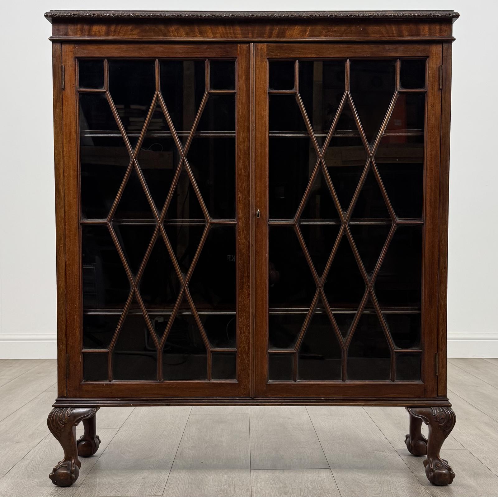 The cabinet stands on elegant cabriole legs with claw and ball feet and is enhanced by a carved frieze, adding character and sophistication.