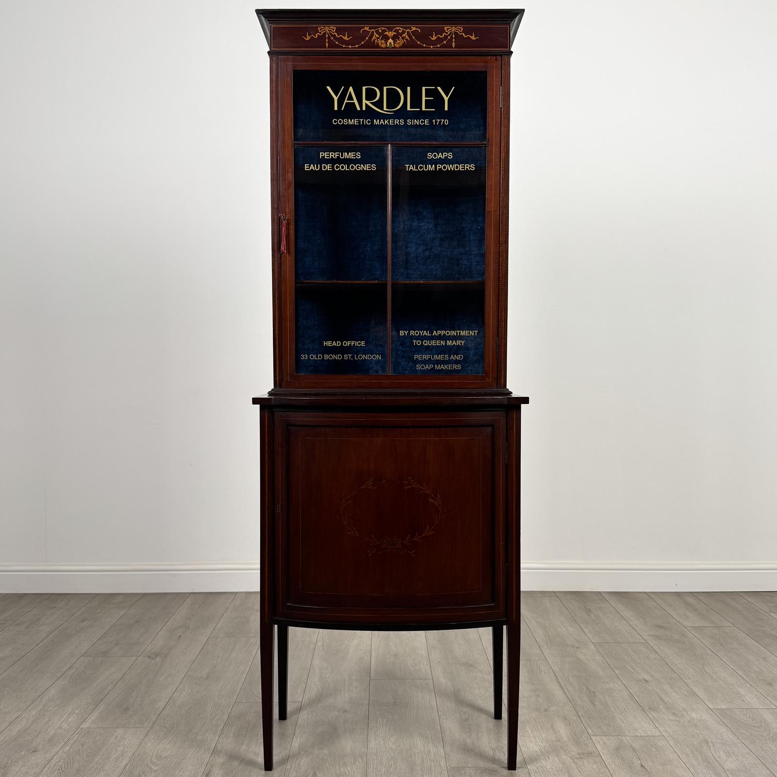The piece is stood on elegant tapered legs and is beautifully inlaid with satinwood stringing, enhancing the rich mahogany tones. A particularly striking feature is the original Yardley decoration to the upper glass, with beautiful writing advertising Yardley, cosmetic makers since 1770. This is complemented by a stunning blue interior, creating a wonderful visual contrast.