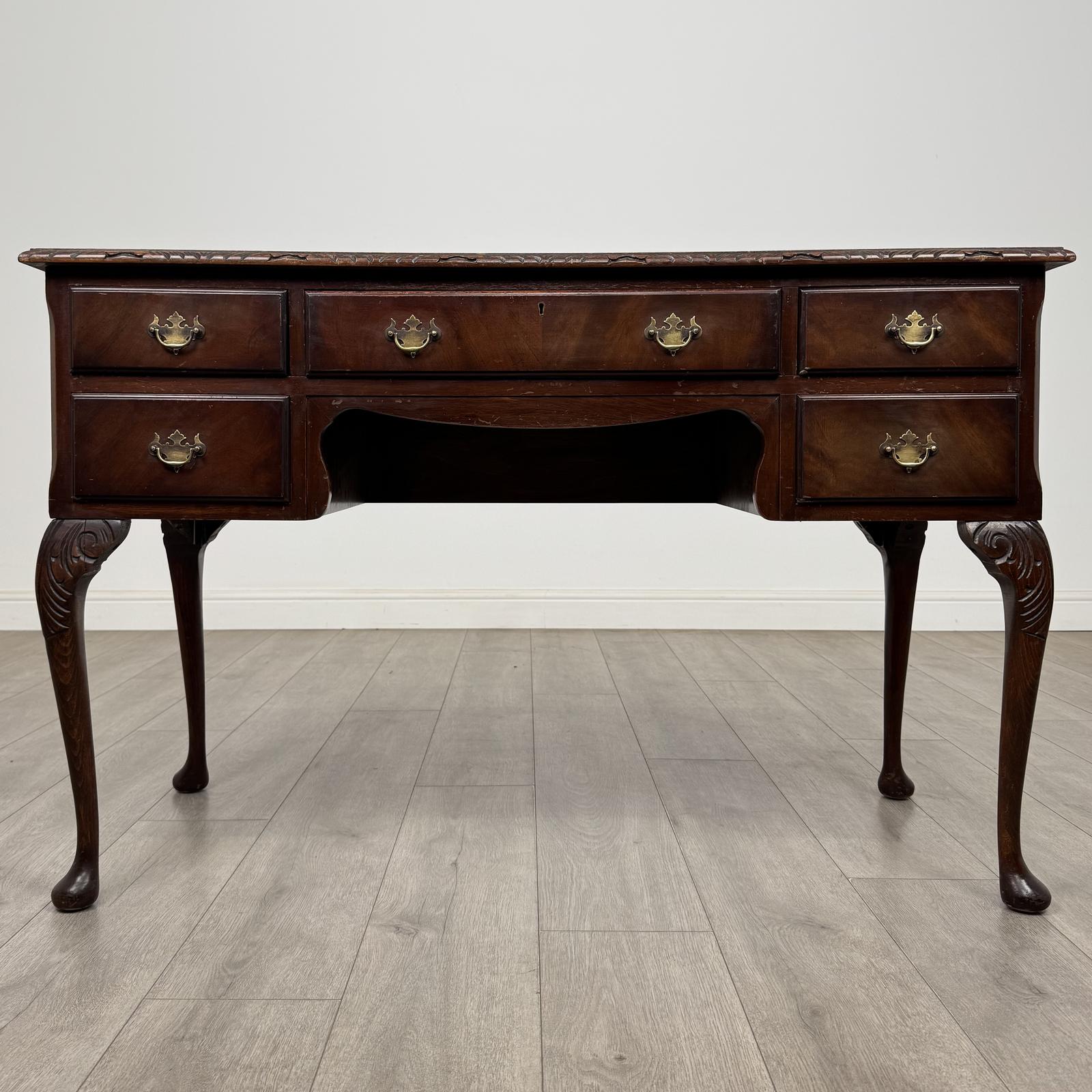 A charming antique 20th century writing table in mahogany, very well made and of good quality, displaying attractive craftsmanship throughout. The table features five drawers in total, arranged as two on either side with a larger central drawer, all retaining their original brass handles. It stands on elegant cabriole legs with carved knees, adding a refined and decorative touch. The carved frieze enhances its overall detail, while the beautiful green leather writing surface provides a practical and classic finish. The mahogany displays a gorgeous grain and rich warm colour throughout, giving the piece a strong and appealing presence.