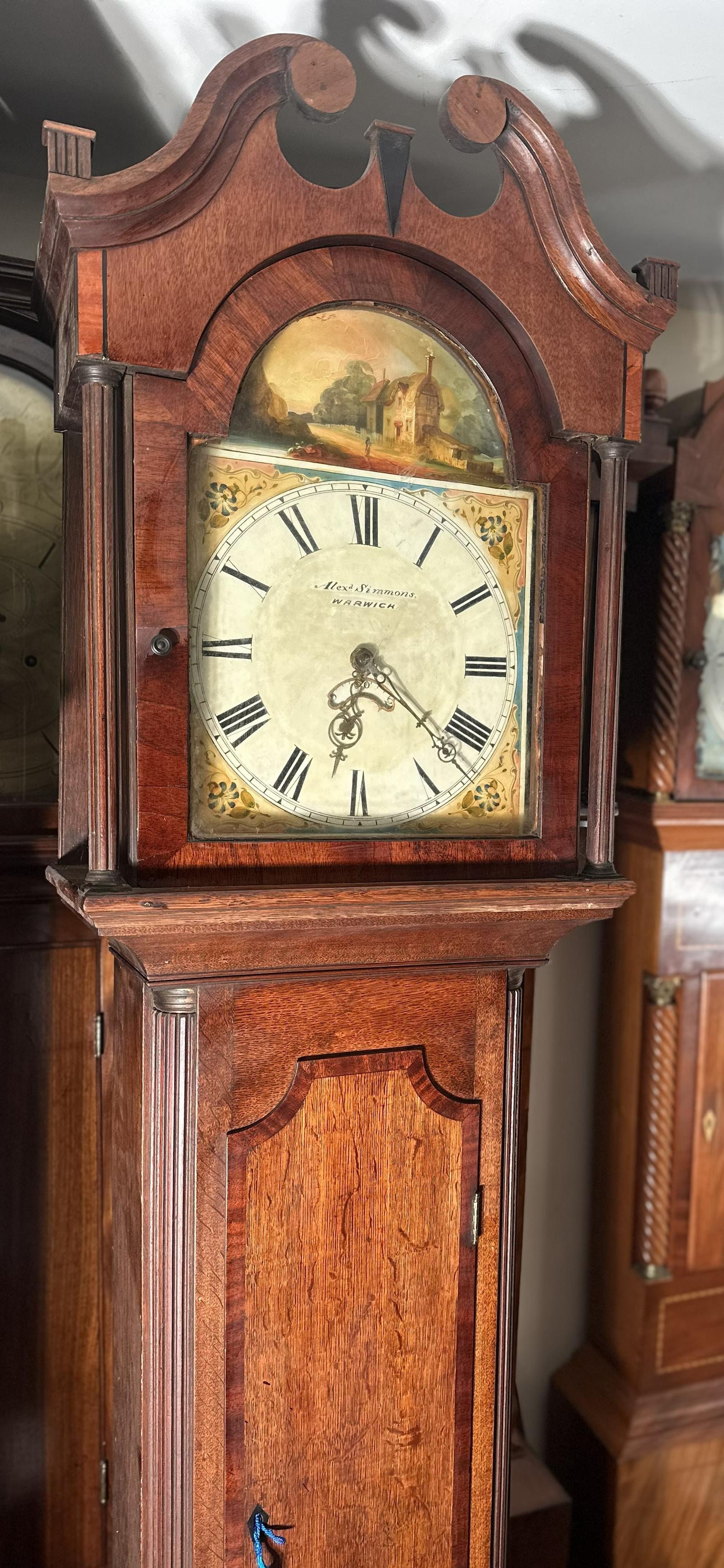 The oak and mahogany longcase Grandfather clock has a case with a long trunk door and a swan neck hood. The case standing just over 83" high. The appealing arched painted dial signed "A SIMMONS of WARWICK" who can be found listed as dated 1835/1880. The 30 HOUR striking movement in good working order. It has a weight and pendulum.