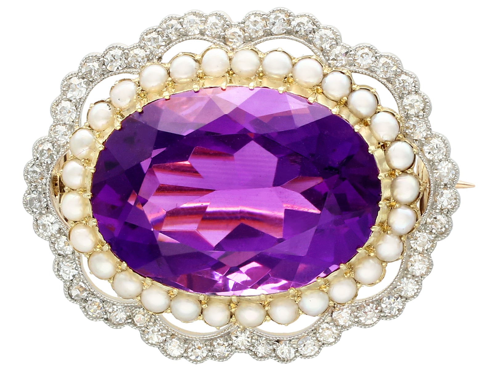 Antique 34.49ct Amethyst and 2.95ct Diamond, Pearl & 15ct Yellow Gold Brooch c.1910 (1 of 9)