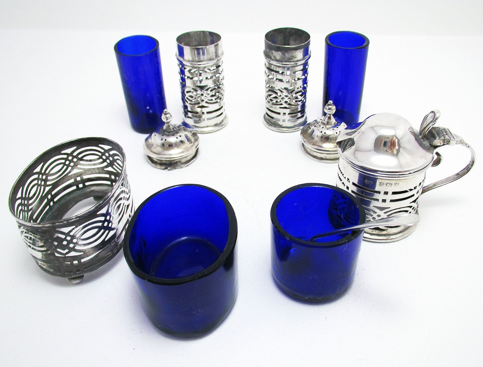 Antique 4-Piece 1918 Solid Sterling Silver Cruet Set (Salt Cellar, Mustard Pot & Spoon, Pepper Pots / Pepperette / Shaker). English Hallmarked (1 of 1)