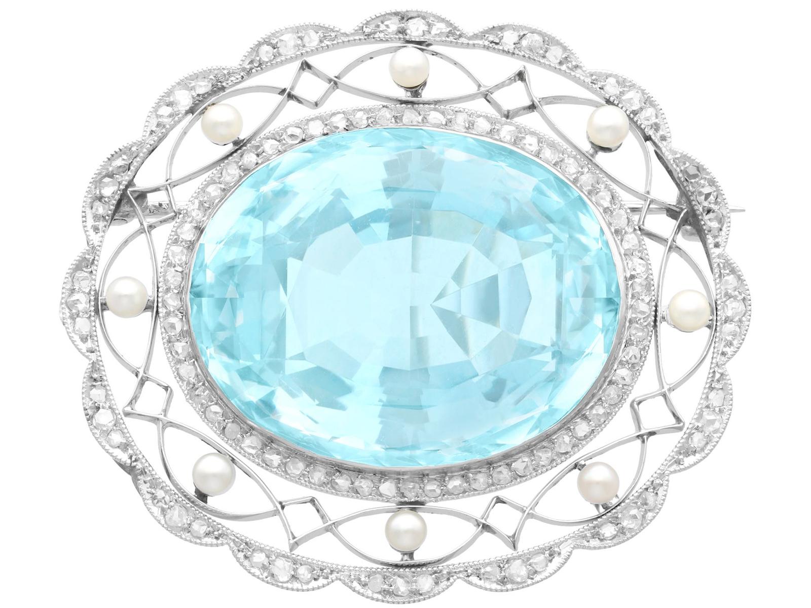 Antique 43.84ct Aquamarine, 0.85ct Diamond & Pearl, Platinum Brooch c.1910 (1 of 9)