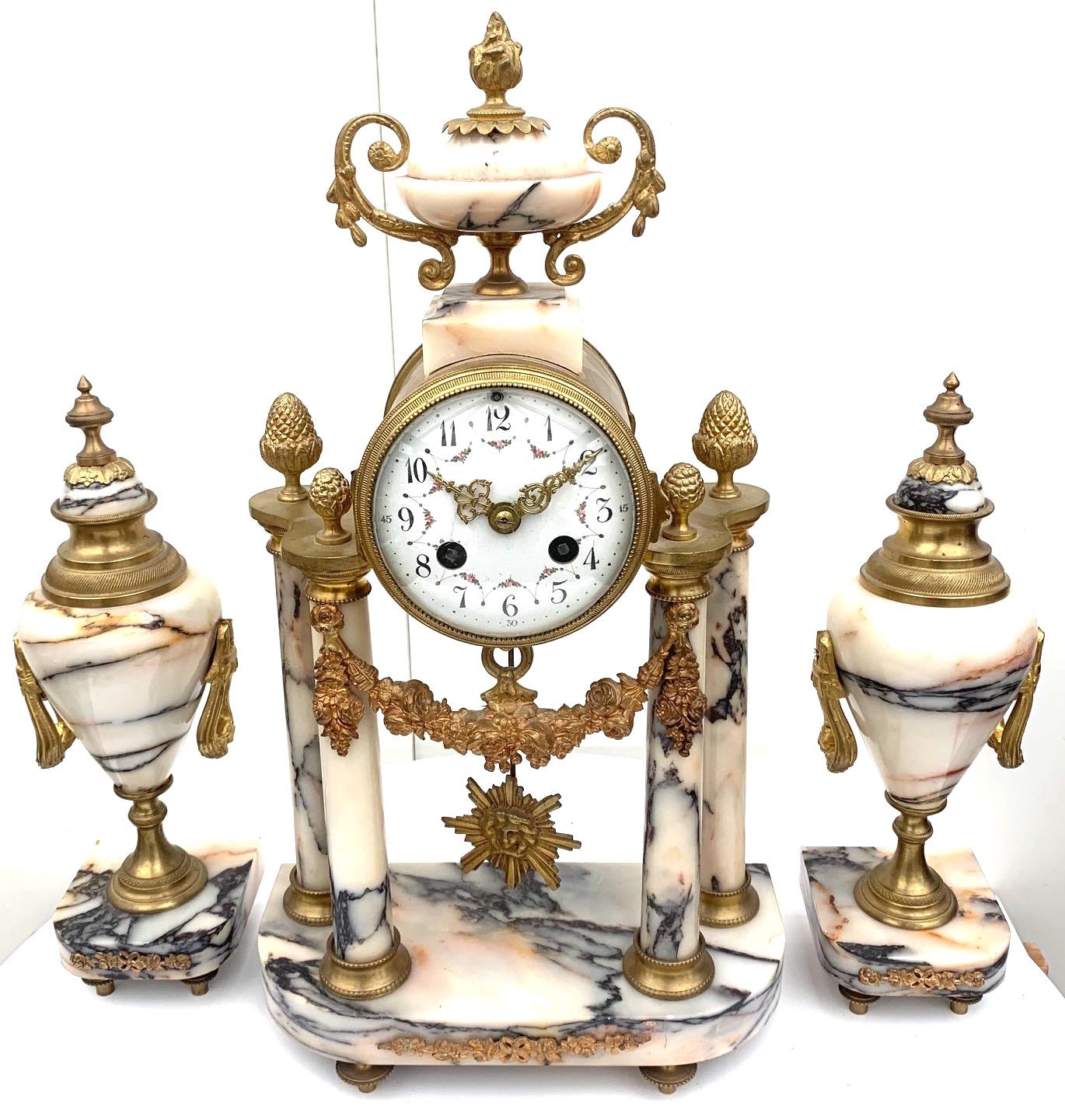 Antique 8 Day French Ormolu & Marble Mantel Clock Set Flank by Garnitures