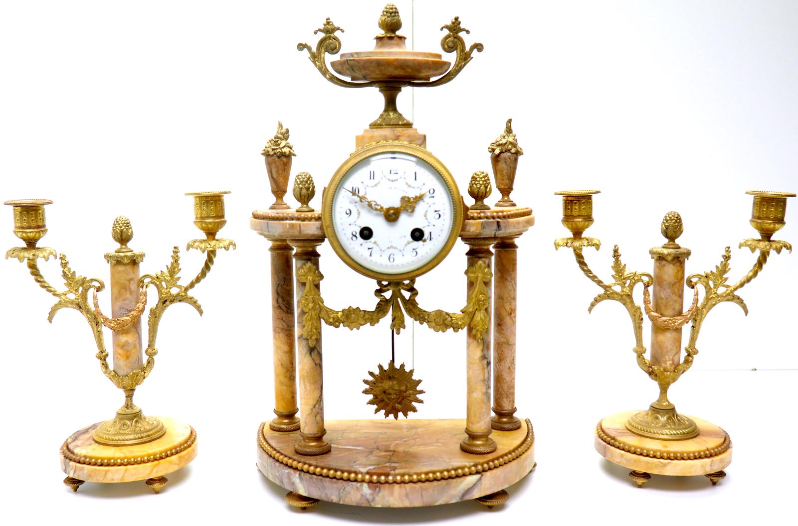 Antique 8 Day French Ormolu & Marble Mantel Clock Set with 2 Branch Candelabras