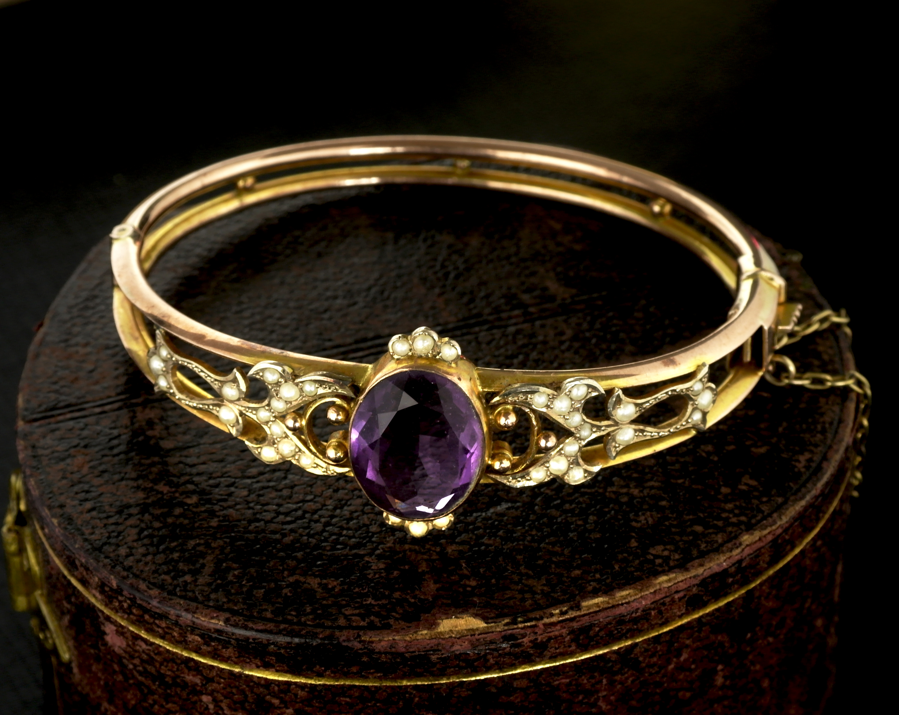 Antique 9ct 9Carat 9k Yellow Gold Amethyst & Seed Pearl Hinged Bangle / Bracelet