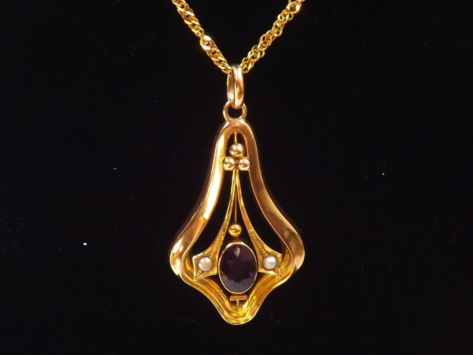 Antique 9ct Gold Amethyst & Pearl Pendant by Murrle Bennett & Co - with 19.5' Chain C.1900