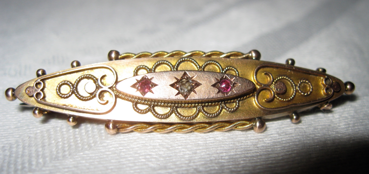Antique 9ct Gold Bar Brooch Set with 2 Garnets & Old Cut Diamond, Chester 1900