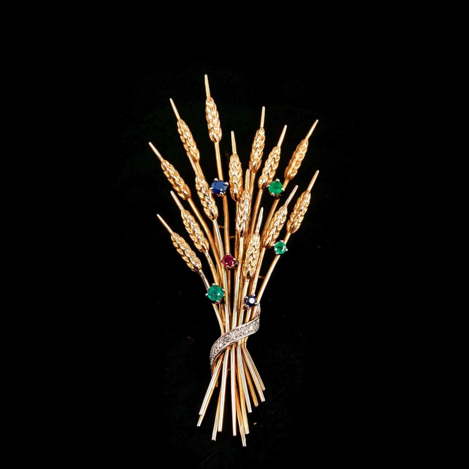 Antique 9ct Gold Harvest Wheat Brooch with Emeralds, Sapphires, Diamonds & Ruby