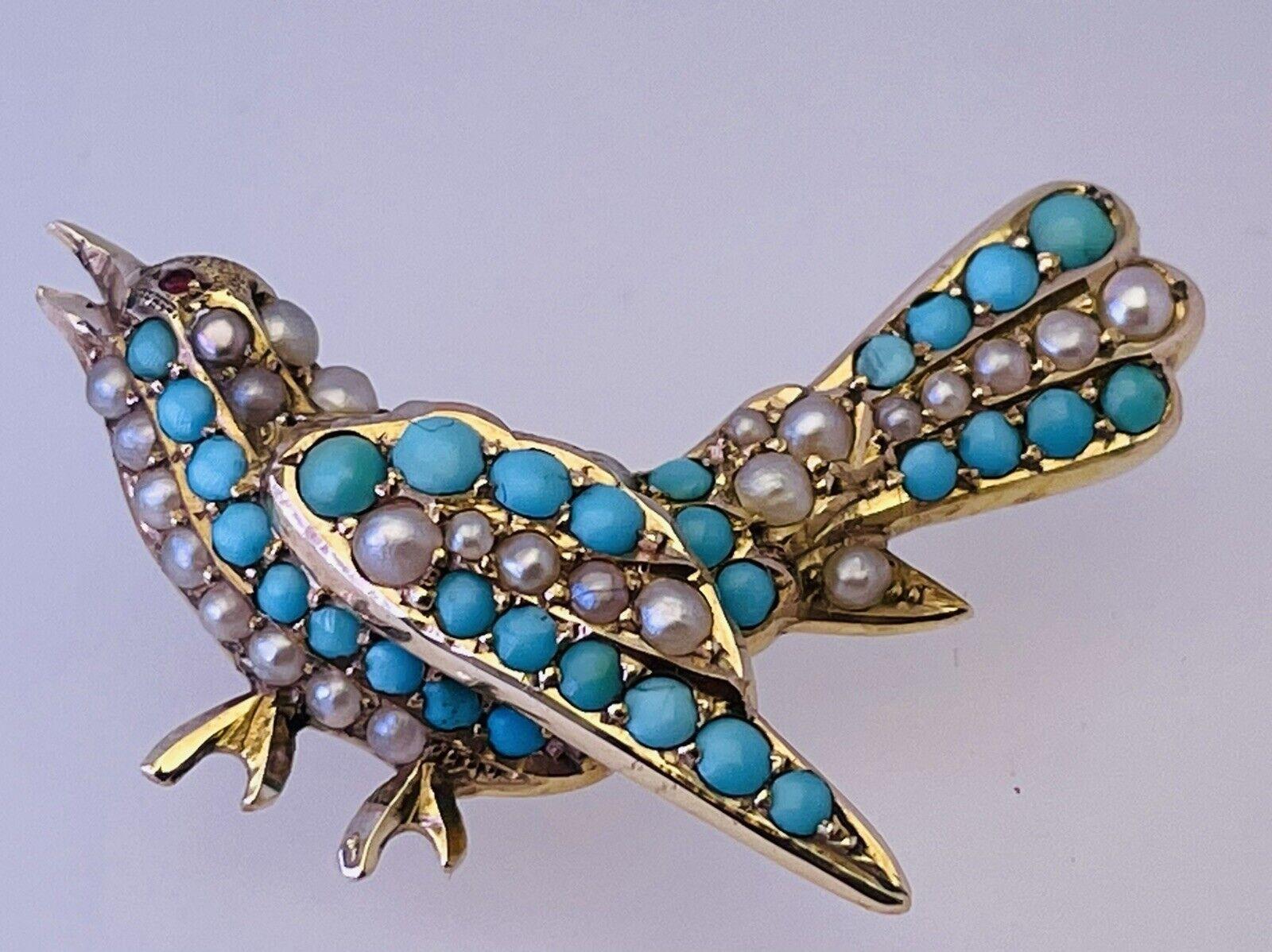 Antique 9ct Gold Turquoise & Pearl Songbird Brooch