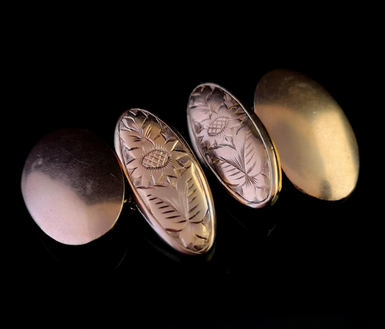 Antique 9ct Rose Gold Cufflinks, Sunflower