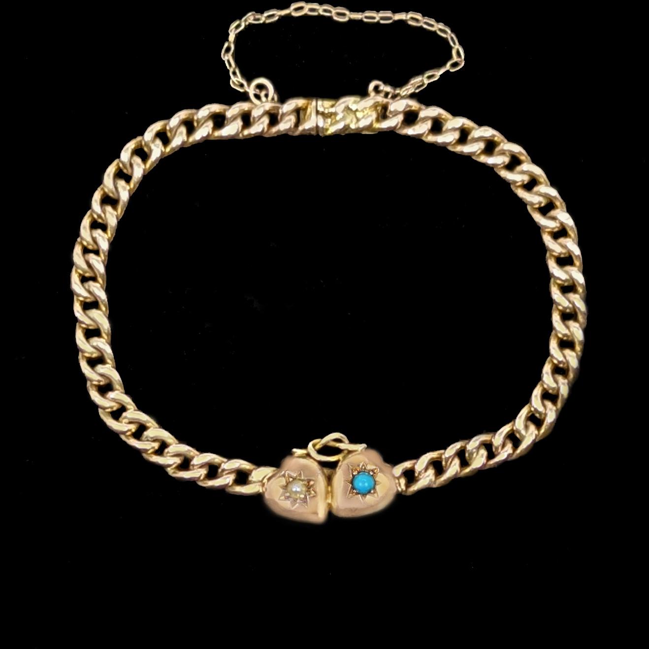 Antique 9ct Rose Gold Turquoise & Pearl Heart Curb Link Victorian Bracelet