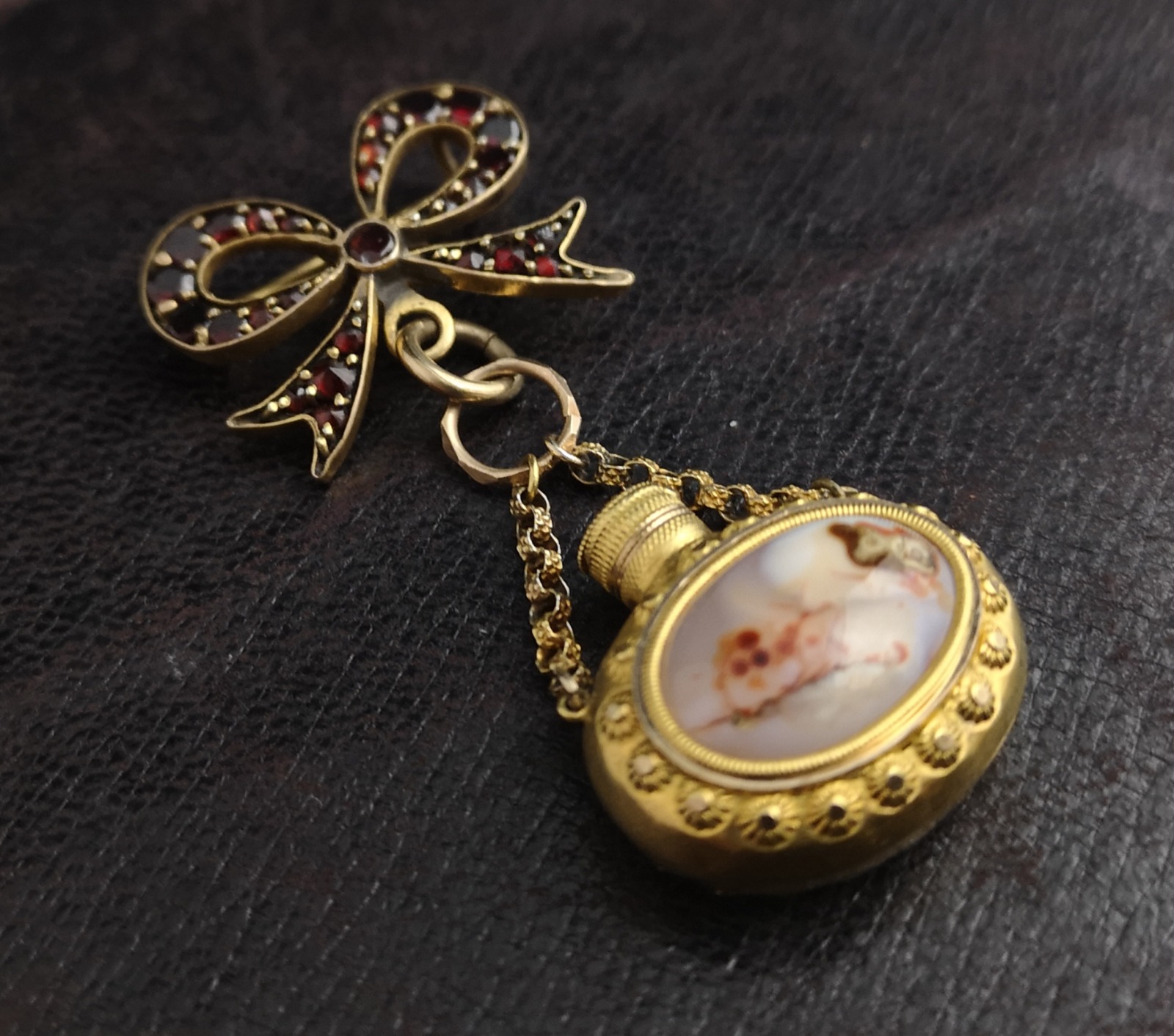 Antique Agate Scent Bottle and Bohemian Garnet Bow Brooch