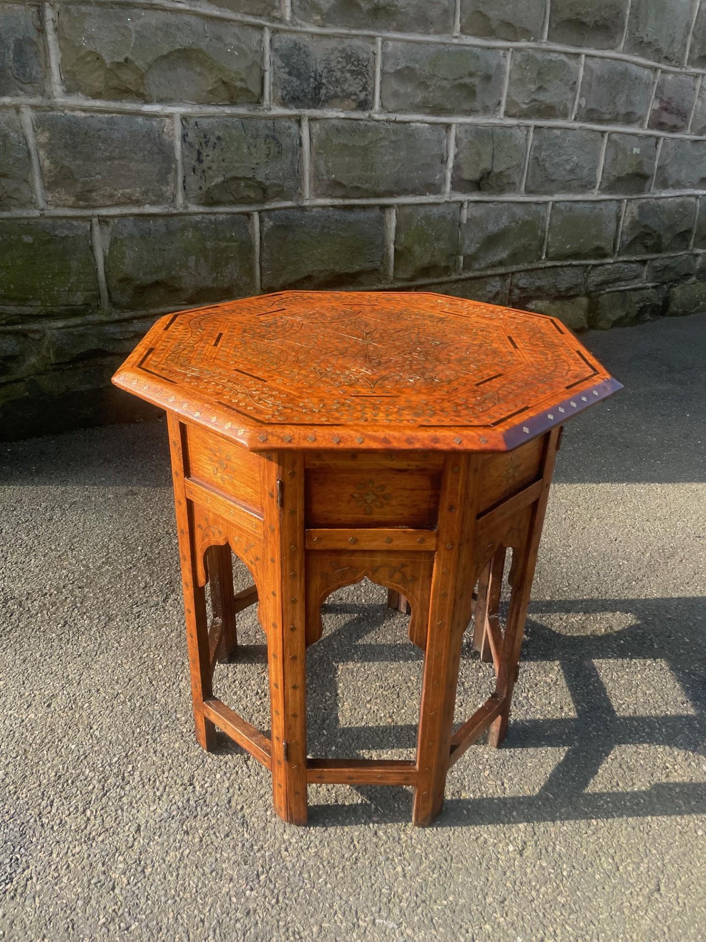 The top inlaid with brass , ebony, & boxwood, standing on a folding moorish style base with matcvhing inlaid decoaration