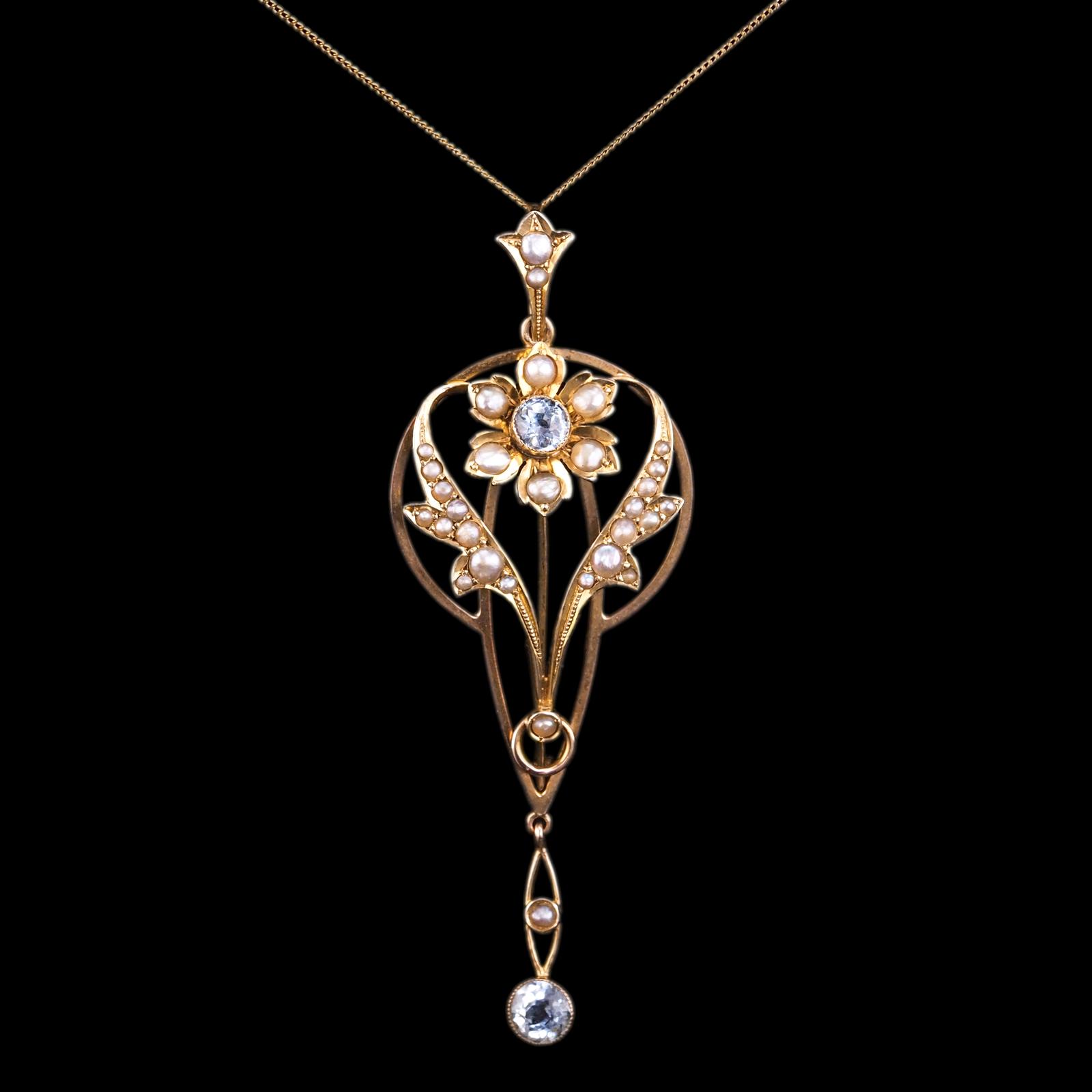 Antique Aquamarine Pendant Necklace with Seed Pearls 9ct Gold Art Nouveau Design - Edwardian c.1905
