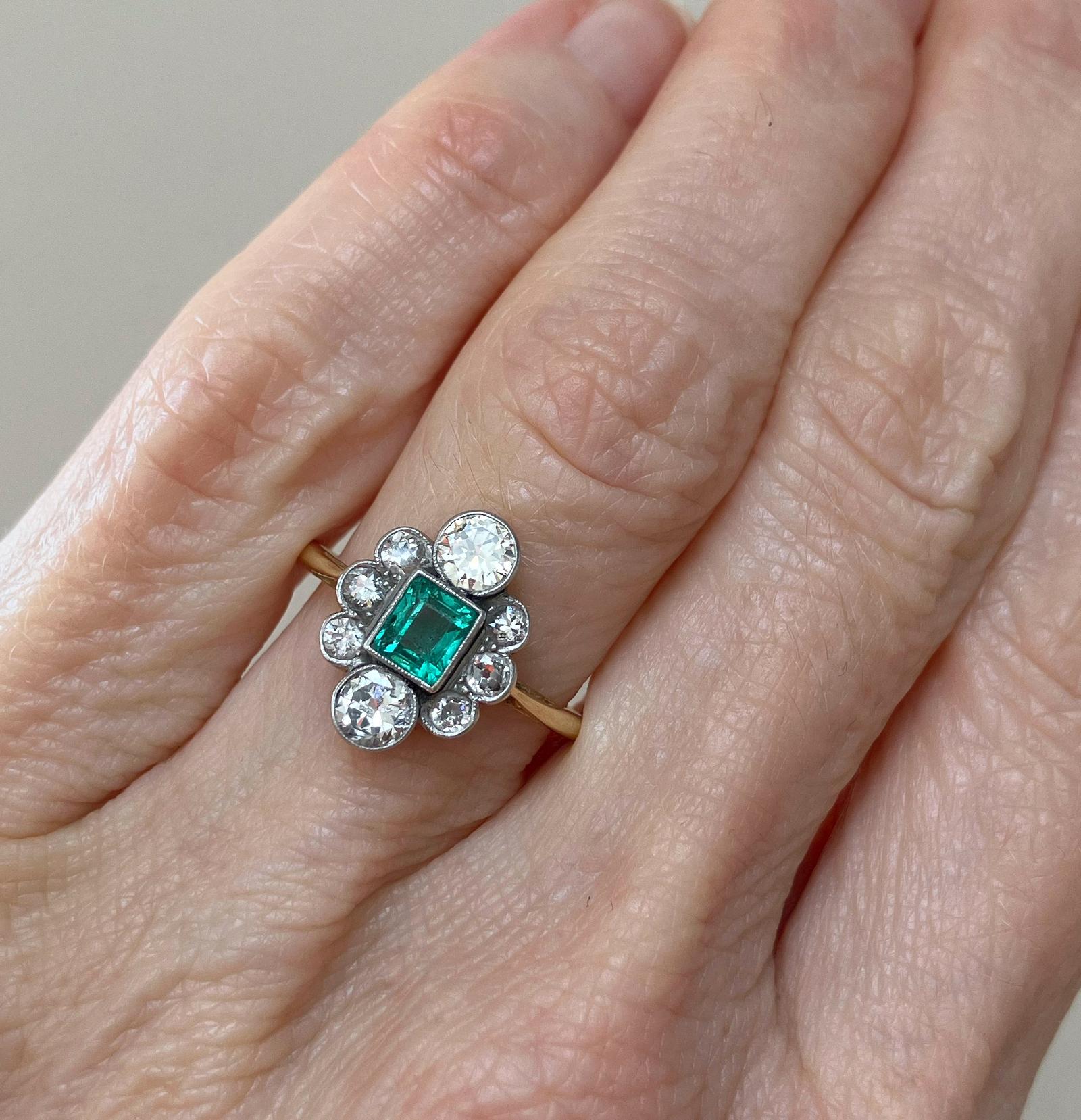 Antique Art Deco 18ct Gold Emerald & Old Cut Diamond Ring -size O