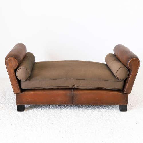 Antique Art Deco Leather Day Bed Restored Linen Cushions c.1920