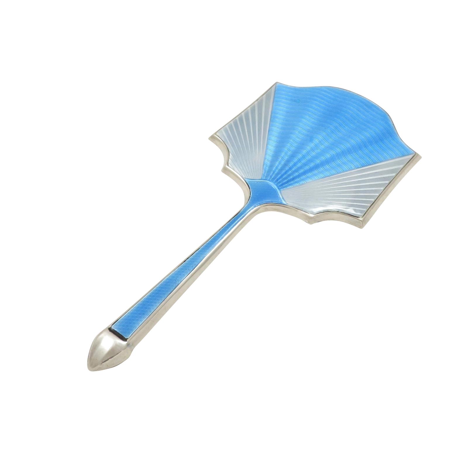 Antique Art Deco Sterling Silver & Blue Enamel Hand Mirror 1932