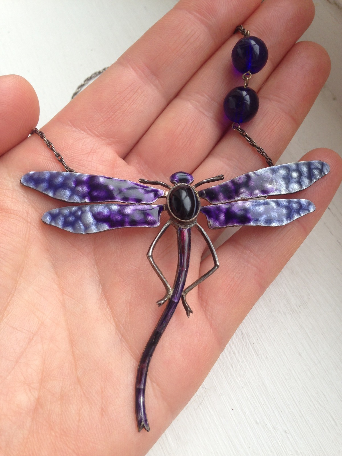 Antique Art Deco Sterling Silver Necklace Enamel & Agate Dragonfly C.1920- 1930s