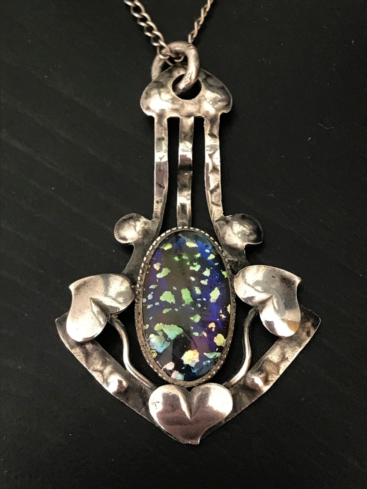 Antique Art Nouveau / Arts & Crafts Silver & Faux Opal Pendant with Chain - 1909 - Payton, Pepper & Sons