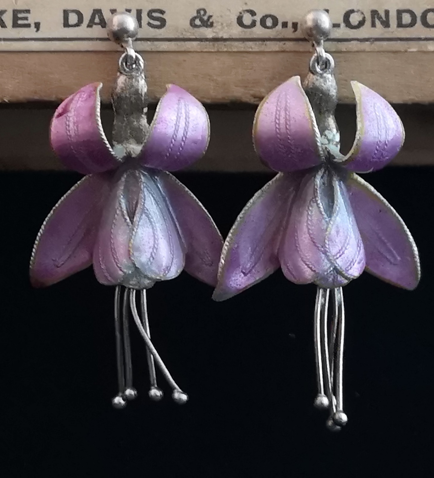 Antique Art Nouveau Flower Earrings, Silver and Enamel