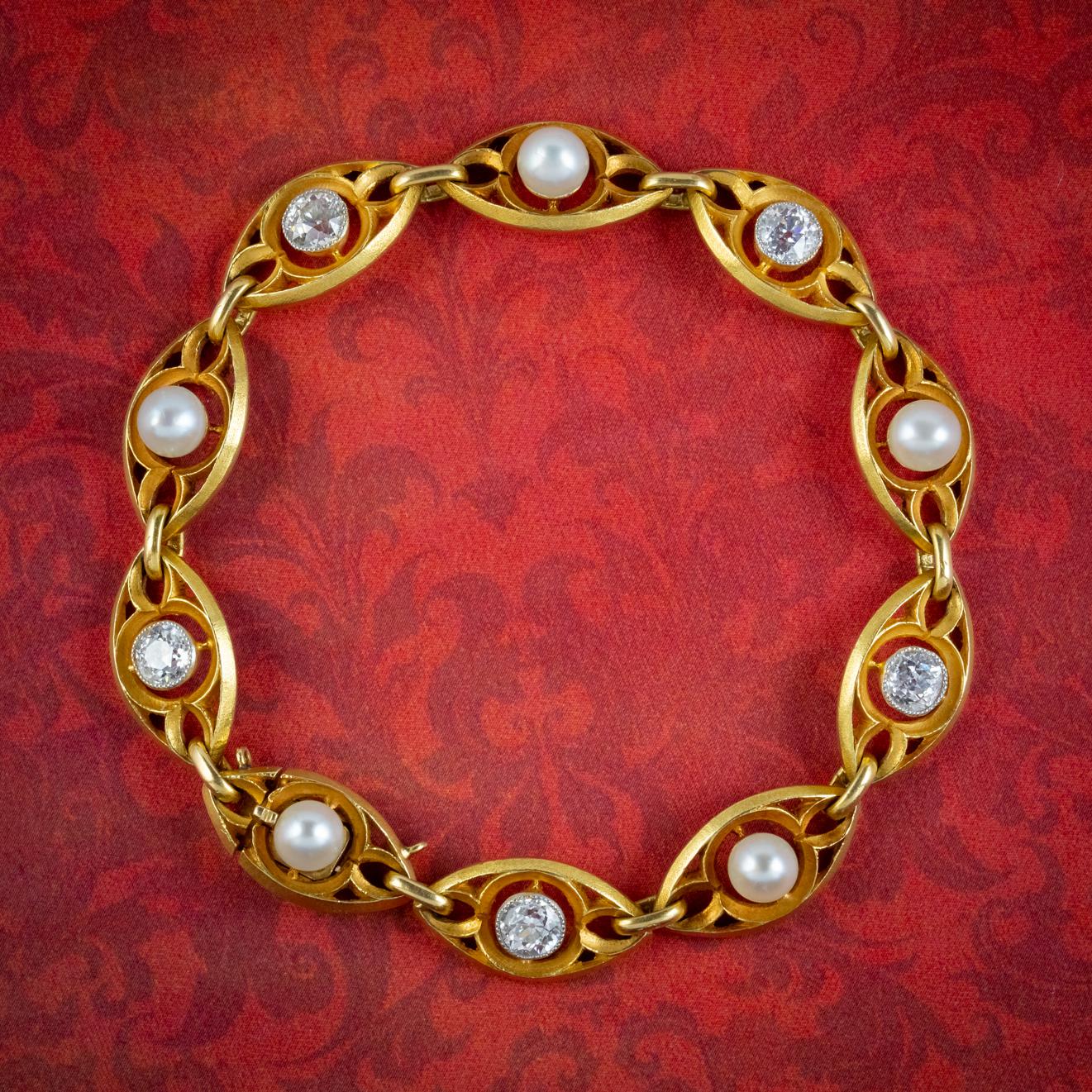 Antique Art Nouveau French Diamond Pearl Bracelet 18ct Gold 3ct Diamond c.1900