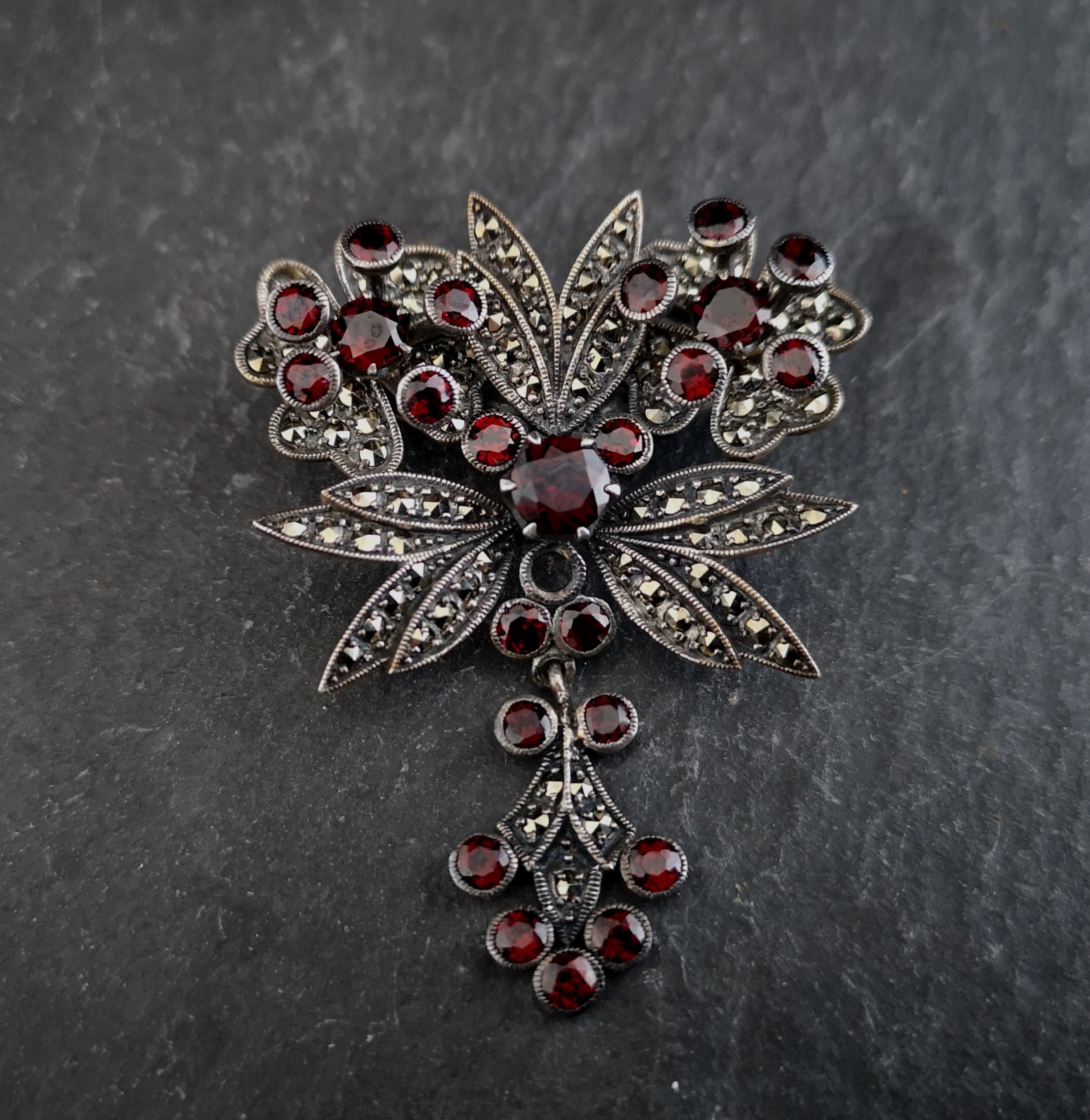 Antique Art Nouveau Garnet and Pyrite Dropper Brooch
