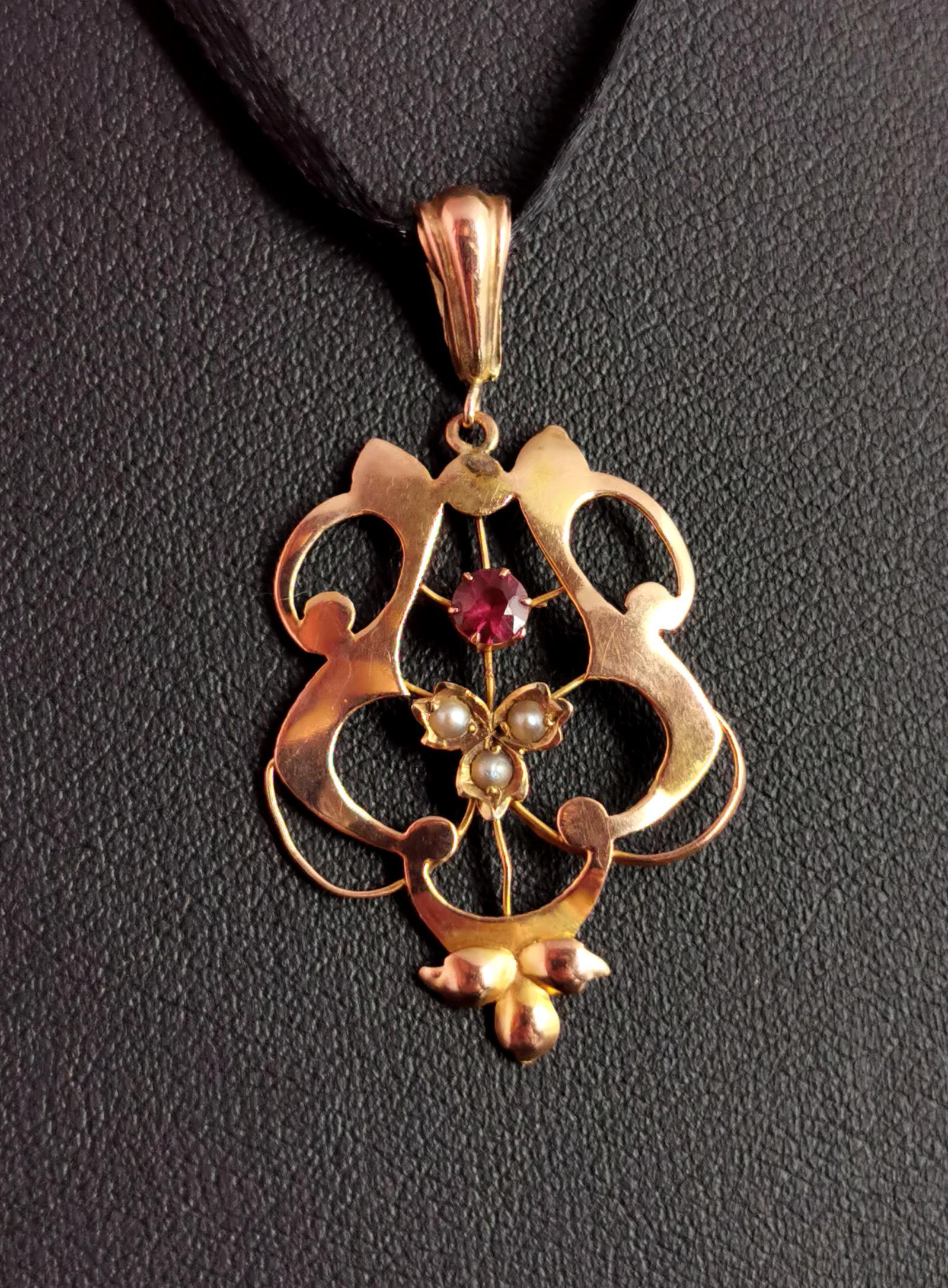 Antique Art Nouveau Lavalier Pendant, Ruby & Pearl, 9ct Gold