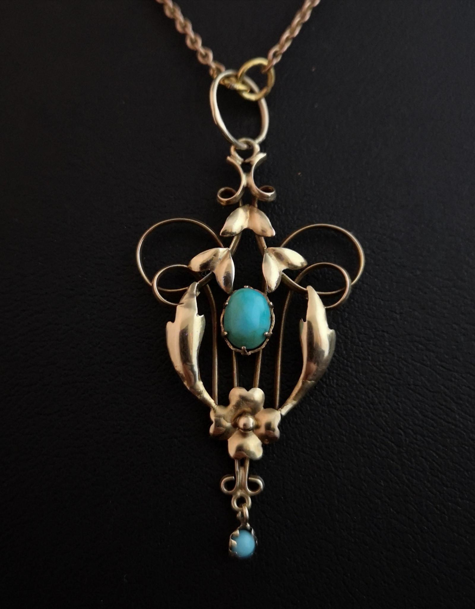Antique Art Nouveau lavalier pendant, Turquoise, 9ct gold