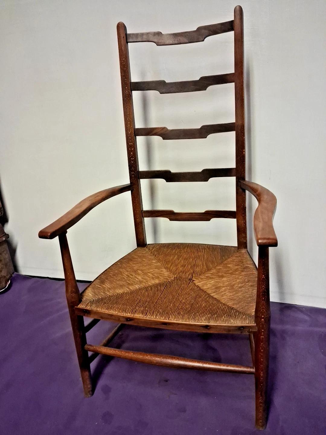 The Art Nouveau ladder-back rush seat chair emerged at the end of the 19th century, serving as a transitional piece between traditional, rustic, rural furniture and the highly stylized, organic designs of the Art Nouveau movement. It was strongly influenced by the Arts and Crafts movement's emphasis on, handcrafting, and simplicity : Hand-woven rush is characteristic, often using materials harvested from rivers.