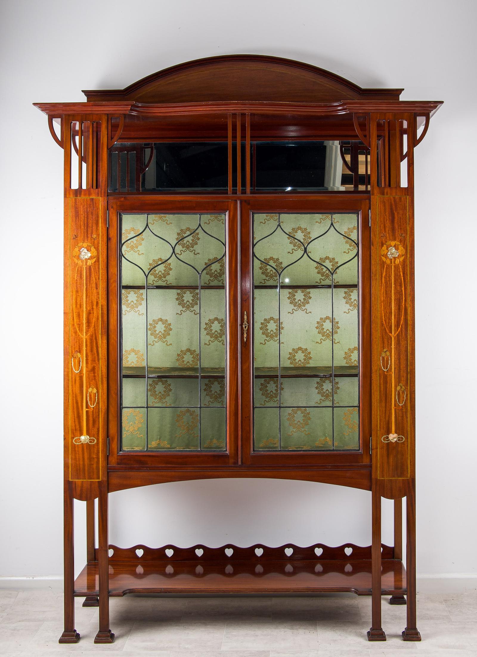 Antique French Walnut Vitrine Display Cabinet With Porcelain Plaques