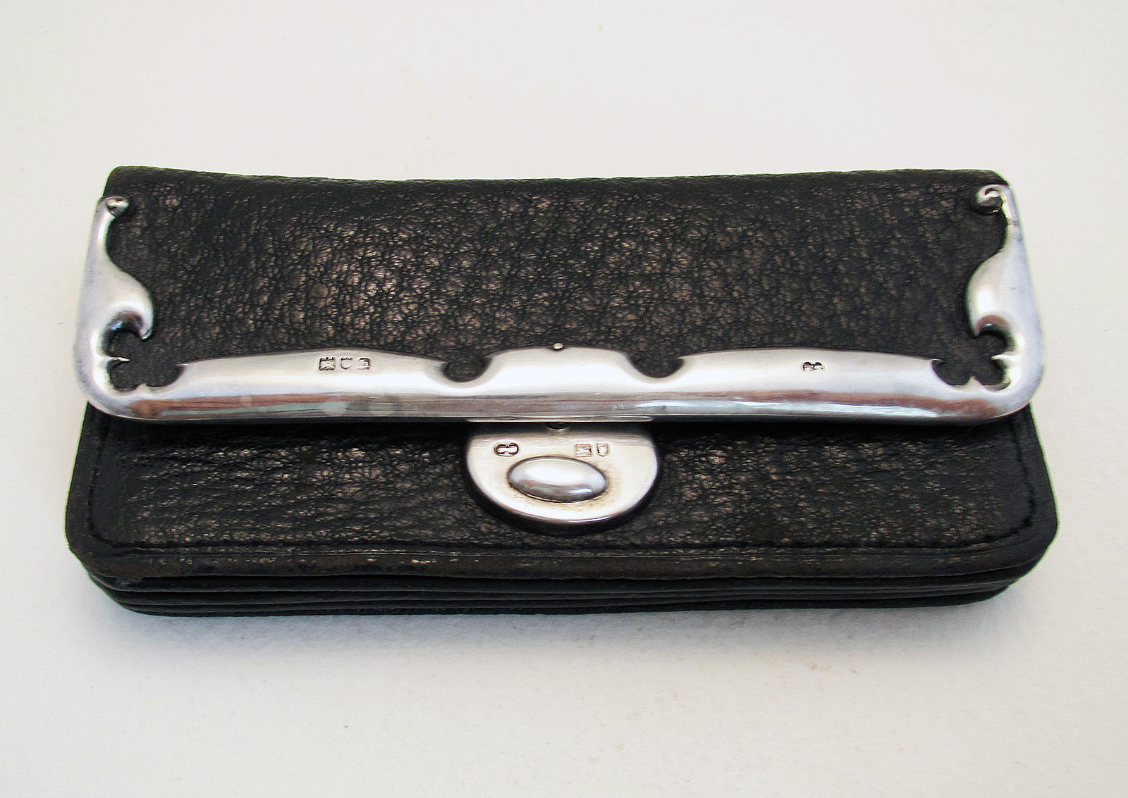 Antique Art Nouveau Solid Sterling Silver & Leather Edwardian Wallet Purse Pocket Coin Stamp Credit Card Case. English Birmingham 1903