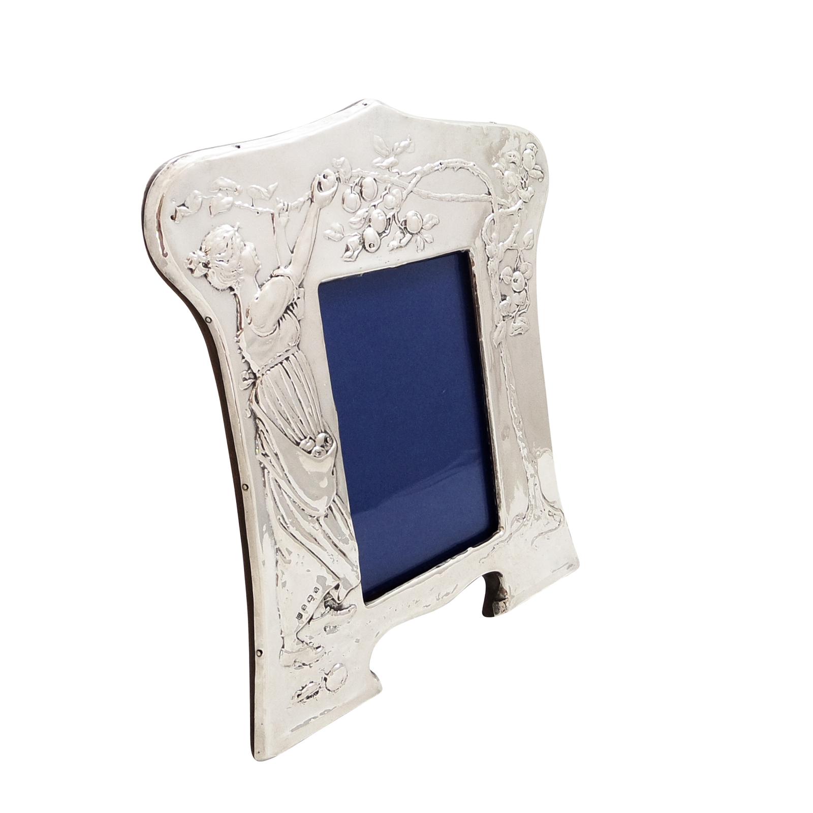 Antique Art Nouveau Sterling Silver Photo Frame - Girl Picking Fruit 1906