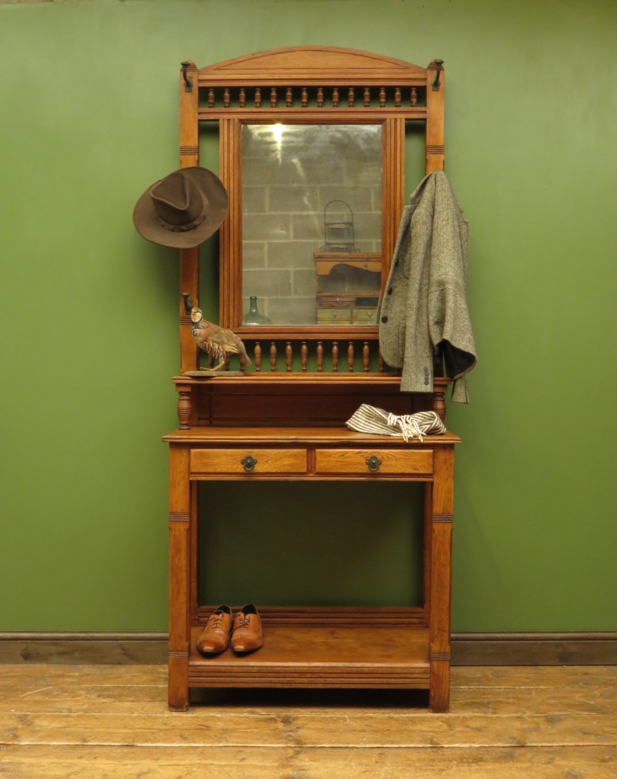 Antique Arts and Crafts Oak Hall Stand Console Table with Hooks & Mercury Mirror