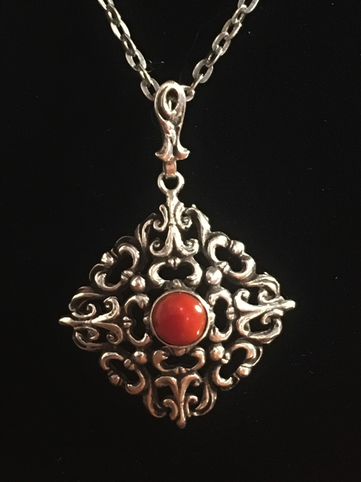Antique Arts & Crafts Austro-Hungarian Silver & Coral Pendant with Period Chain c.1900 (1 of 1)