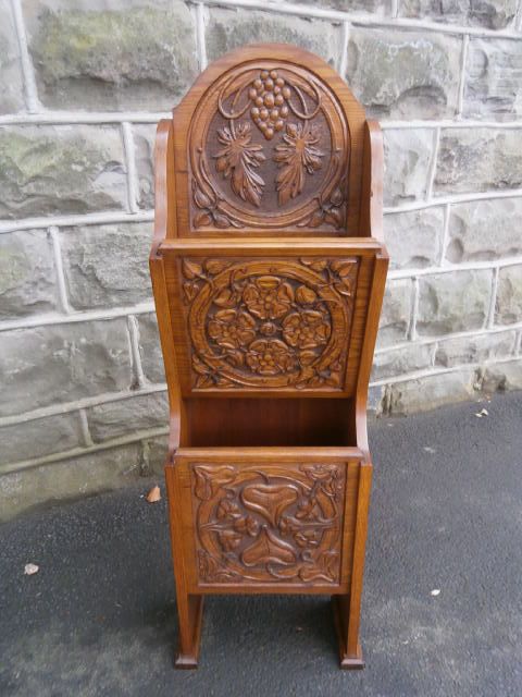 Antique Arts & Crafts Carved Oak Waterfall Magazine Rack / Folio Stand c.1900