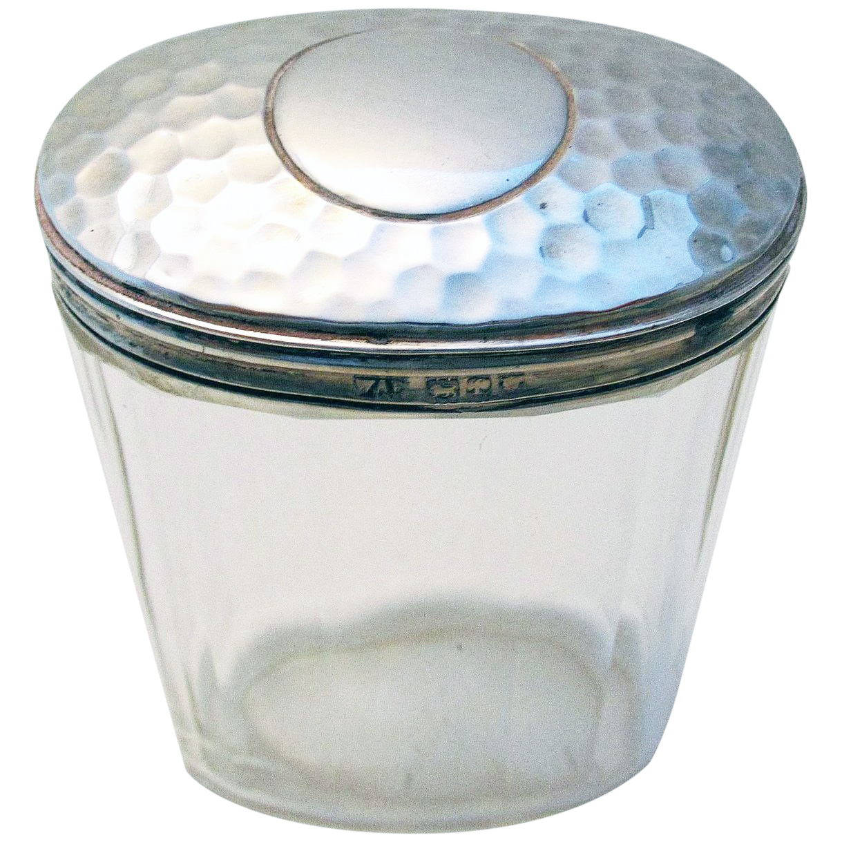 Antique Arts & Crafts English Solid Sterling Silver Top Lidded Glass Dressing Table Oval Cream Lotion Bottle / Jar / Pot / Container